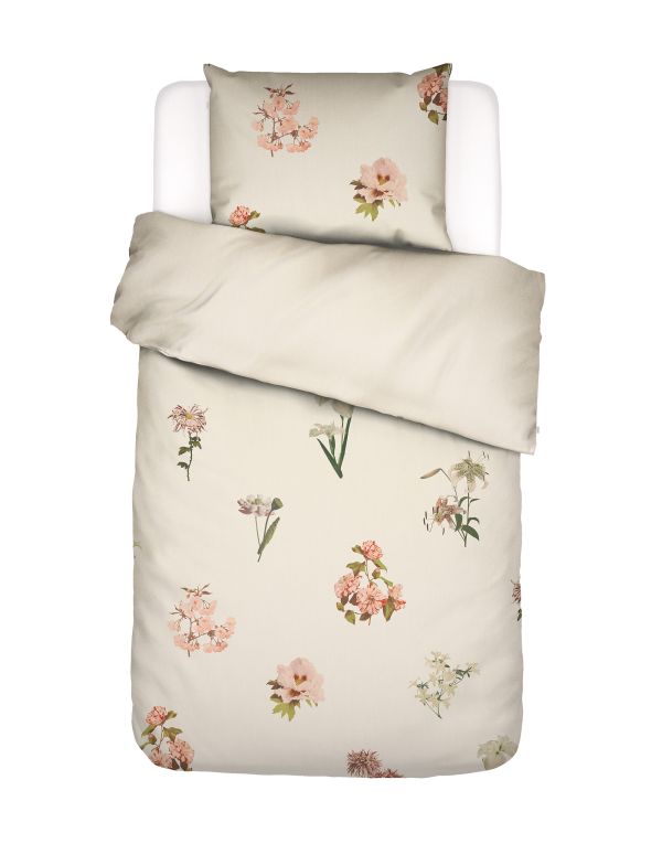A romantically widely placed floral print on a calming plain background. In the Annebella, you will find various flowers such as a striped camellia, lilies, Japanese peony, cherry blossom, Japanese iris, chrysanthemum, and lotus flower. These flowers are sourced from the Rijksmuseum in Amsterdam. They are coloured photographs taken by the Japanese photographer Kazumasa Ogawa, around 1890. The generous placement on a soft, slightly contrasting background creates a captivating print. Turn the duvet cover over to balance the picture with a calming, unicoloured side in the same colour.
