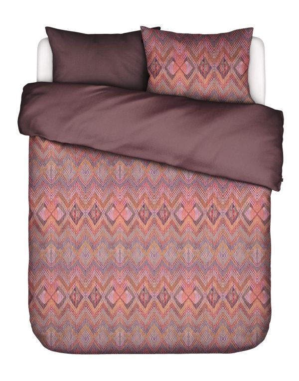 Let yourself be enchanted by this spectacular cotton satin duvet cover set from ESSENZA. Modern terra shades like brown and orange come together beautifully with pink, lilac and deep purple colours to create a sophisticated graphic pattern. The reverse of the Fabienne duvet cover is a mauve colour.