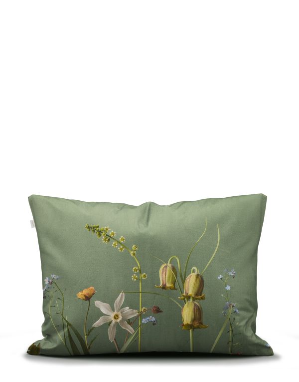 Ficaria toont vrij werk van fotografe Kreetta Järvenpää (geboren in 1974, Finland). Dit werk is gemaakt in het voorjaar, wat te zien is aan de keuze van gele en oranje tuinbloemen zoals een Narcis in volle bloei, en meer delicate bloemen zoals belvormige hangende Frittalaria’s en het subtiel speelse accent van fel blauwe ‘vergeet me nietjes’. Allemaal bloemen die ook in haar eigen tuin groeien, en daarmee een heel persoonlijk gevoel leggen in dit beeld. Waar Kreetta normaal gezien veelal voluminieuze bloemstukken fotografeert, is dit tafereel heel luchtig, wat het fris zonnige voorjaarsgevoel nog beter naar voren laat komen. Sla het dekbedovertrek om, om het geheel te balanceren met een rustgevende uni in dezelfde kleur.