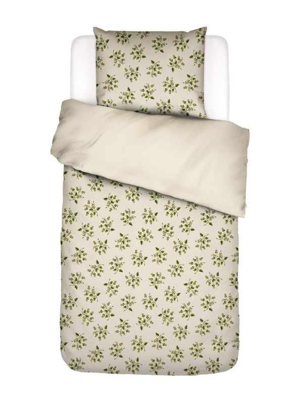 The romantic Jolien print, inspired by an embroidered branch from a 19th-century album at the Rijksmuseum, brings historical charm to your bedroom. On the softly coloured background, the carefully embroidered branches with green leaves and buds accentuate the feel of artisanal craftsmanship. The branches, rich in detail, weave harmoniously through the design, offering a timeless and soothing contrast. Turn Jolien over and discover how the solid background colour brings balance to the overall look. The duvet cover is made from 100% organic cotton with a linen look, giving your bedroom a natural and serene feel. This fabric is breathable and moisture-absorbing, ensuring optimal sleeping comfort. The texture of the cotton adds extra depth to the print and enhances the luxurious feel.Onderkant formulier
