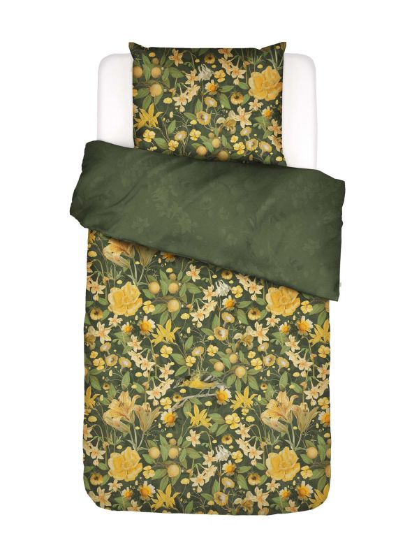 Lovely Lisa! This print is a collection of various yellow elements from the Rijksmuseum. Our designers used these to make their own composition, and because all these images in nature actually have these colours, it just feels right. The thyme coloured background gives it a surprisingly strong look. On the reverse side of the duvet cover, the print is used in tonal colours. This allows the print to still be visible, without interfering with the front side. The yellow tones jump out from the canvas, so if you like boldness and warmth in the bedroom, Lisa is your match.