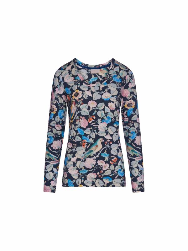 ESSENZA top Luyza has an elegant round neckline and long sleeves. The back of this comfortable top is slightly longer than the front, giving it a feminine shape and fit. Made from the sustainable material Lenzing™ EcoVero™. This material is similar to viscose: lovely light and silky soft, drapes loosely around the body, is comfortably stretchy, breathable and has a soft sheen. The Aleste print shows an elegant and vibrant composition of flora and fauna. Several birds sit on branches amidst the flowers and leaves, creating a natural and almost poetic scene. The subtle shadows and soft contours of the petals give the composition a dreamy feel.