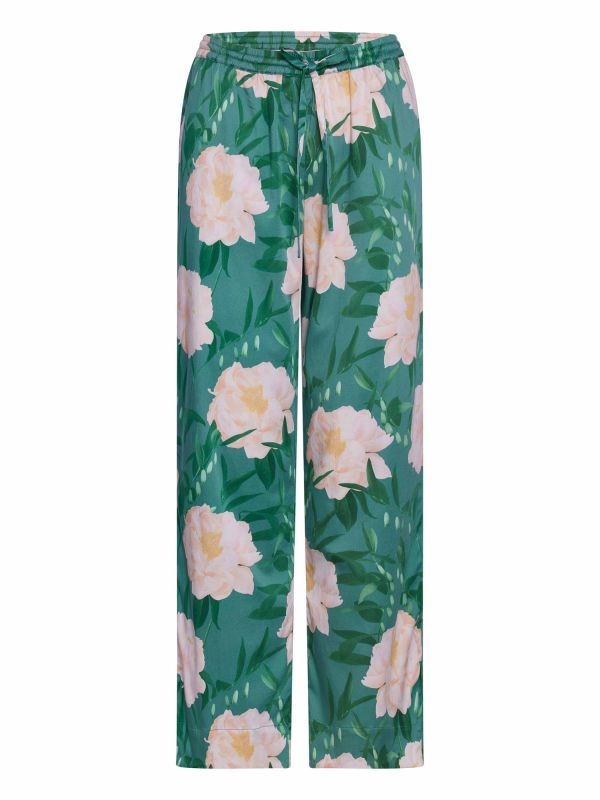 The rich fabric, the mid-rise waist and the elastic waistband with draw string make these into the perfect pyjama trousers. This item is made from the sustainable modal fabric combined with cotton. Modal is made from the pulp of beech wood and is, due to its softness, the perfect fabric for underwear and pyjamas. This woven variety with subtle shine is considered to be a very luxurious fabric and has in this instance been blended with cotton and elastane for extra durability. The fabric is soft, drapes loosely around the body and has a comfortable stretch. This all-over print shows a graceful collection of peonies in subtle pastel pink hues that contrast beautifully against a soft, green background. The flowers are richly scattered and surrounded by green leaves, with occasional tiny buds of the sagebrush about to bloom. The design was developed in collaboration with photographer Kreetta Järvenpää (born 1974, Finland).