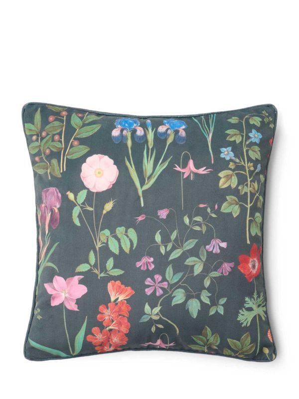 Bring any bedroom or living room to life with this square decorative cushion. The elegant piping and super soft, slightly shiny velvet material make this cushion extra special. The enchanting Marigold print shows a rich variety of flowers. Each floral element, from the wild rose, anemone, iris, clematis, peony, blue cornflower, nasturtium, campanula, grape hyacinth to the marigold, is carefully crafted and contributes to the vibrant garden. The marigold is the smallest flower in the whole but is the namesake for this design. The green leaves weave through the composition, offering a fresh contrast. The dimensions of this cushion are 50x50 cm.