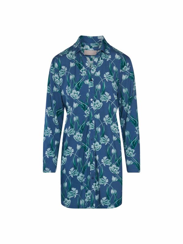 The Valentina nightdress has a loose fit and is therefore comfortably oversized. The dropped shoulder design gives the nightdress a contemporary and relaxed look. It offers ample freedom of movement and ensures an effortless and comfortable fit. The pointed collar, inspired by the classic shirt, adds a touch of sophistication to the design. This elegant collar gives the nightdress a subtle but stylish appearance, ideal for women who want to exude a touch of chic even in their nightwear. Made from the sustainable material Lenzing™ EcoVero™. This material is similar to viscose: lovely light and silky soft, drapes loosely around the body, is comfortably stretchy, breathable and has a soft sheen. This richly designed print shows an arrangement of tulips in a playful and flowing pattern. The tulip varies in different stages of flowering: from closed bud to a fully opened flower. The tonal use of colour gives this print a modern feel. The design was developed in collaboration with photographer Kreetta Järvenpää (born 1974, Finland).
