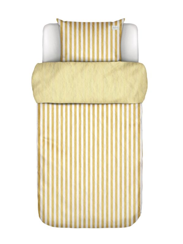 The well-known Classic Stripe by Marc O'Polo has been reinvented this season! The classic but casual look remains, however the duvet cover set is now made from high quality cotton percale. For both a premium casual look and a nice airy feeling in bed. These sunny yellow stripes are all you need this summer! If you are in the mood for some thinner stripes, then just turn the duvet cover over. The brand name shows at the bottom of the duvet cover. For a finishing touch the duvet cover is wrapped in a cover of the same fabric, which you can reuse, for example as a decorative pillow cover. A sustainable choice!