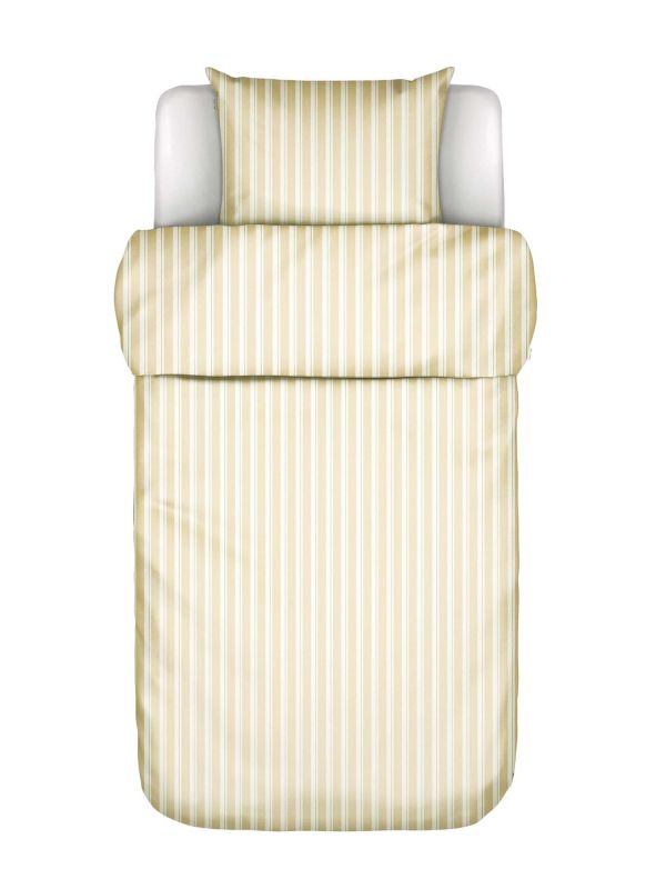 Diagonal striped design in a mix of brown, green, and white tones with a washed look. The material feels crisp and cool against the skin, offering a timeless, natural appearance. With its matt finish, this duvet cover is breathable, soft, and comfortable. Crafted from yarn-dyed, GOTS-certified organic cotton percale, it embodies enduring quality and natural elegance.